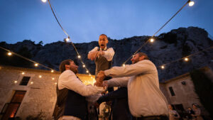 Le cœur de la fête se déroule ensuite au Domaine du Rocher à Orgon, un lieu d’exception offrant un cadre enchanteur. Entre les oliviers et la pierre blanche, l’ambiance est chaleureuse et élégante. J’immortalise les discours, les éclats de rire, l’ouverture du bal, ainsi que les moindres détails de votre décoration. Les jeux de lumières en soirée apportent une touche magique aux clichés, sublimant l’atmosphère de votre mariage.